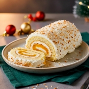 - Montez la bûche : déroulez délicatement le biscuit refroidi et imbibez-le légèrement avec le sirop. Étalez sur le biscuit la garniture à la mangue, à la noix de coco et à la ricotta. Recouvrez de crème fouettée, tout en réservant une partie pour étaler sur la bûche une fois roulée. Roulez le biscuit délicatement (sans trop serrer) pour former la bûche. Placez la bûche au réfrigérateur pendant au moins 2 heures pour qu'elle se raffermisse.