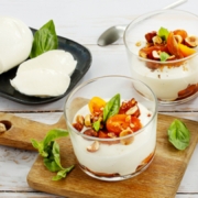 Déposez de la mozzarella Casa Azzurra sur le velouté. Ajoutez un peu de salade émincée et des raisins secs, pour la garniture.